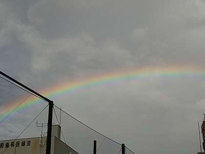 朝、学校に出勤すると、学校の西側空にくっきりと虹がかかっていました。