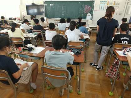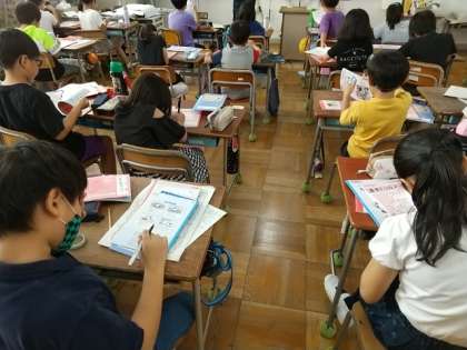 各教室では、2学期に使うドリルやワークが配られたり、夏休みに頑張った作品を集めたりと学級活動が行われていました。宿題の答え合わせをしている学級もありました。
