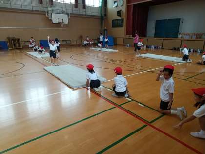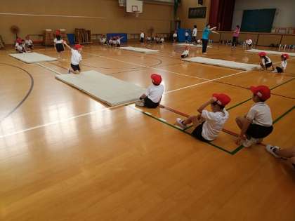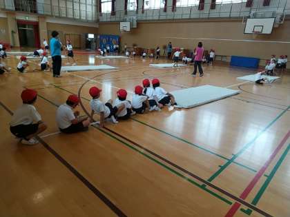 1年生が、マットの上で、いろいろな動きを体験していました。遊びながらマット運動の感覚を身につけていきます。