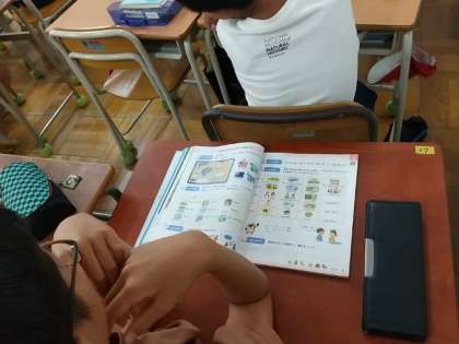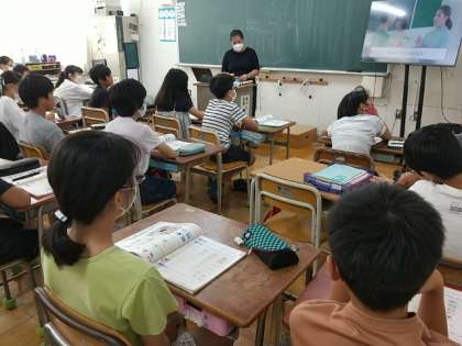 6年生が外国語活動の時間に、夏休みの出来事について英語で伝え合う学習をしていました。