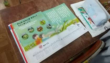 グループで歌詞を読み、どんな歌い方やみぶりをつけるといいかを話し合っていました。
