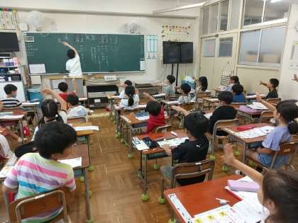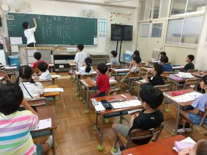 まず先生が、筆順や四つに分けたマスのどのあたりから書き始めるかを1画ごとに丁寧に指導します。その後、特に気をつけるところ(「はらい・はね」や横画の長さ、バランスなど)を確認します。先生の指書き(空書き)に合わせて、子どもたちも顔の前で指書きをします。