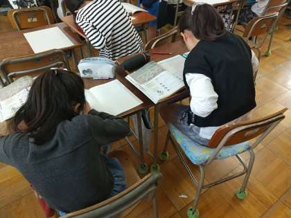 今は、天神祭りの現在の様子を写した写真と昔の様子を描いた資料を比べ、変わってきたことや続いていることについて考え、まとめていました。