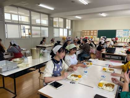 PTA給食試食会が開催されました。他校より栄養教諭にお越しいただき給食に関するお話をしていただいたあと給食を試食していただきました。献立は小麦アレルギーのある子どもも食べることができるように米粉をのカレールウを使用したポークカレーライスでした。参加されたみなさん、お味はいかがでしたか?