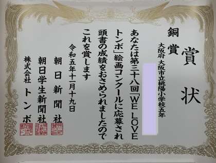 5年男子が、第38回「WE LOVE トンボ」絵画コンクールで、銅賞を受賞しました。