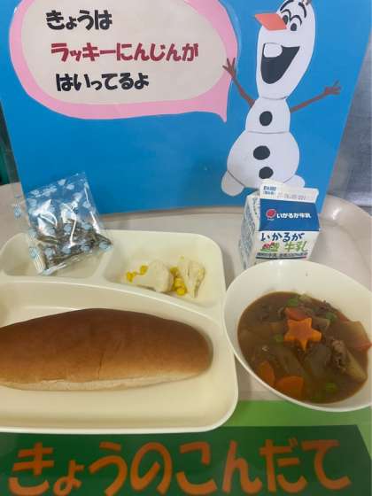 ●ビーフシチュー ●カリフラワーとコーンのサラダ ●ミニフィッシュ ●牛乳