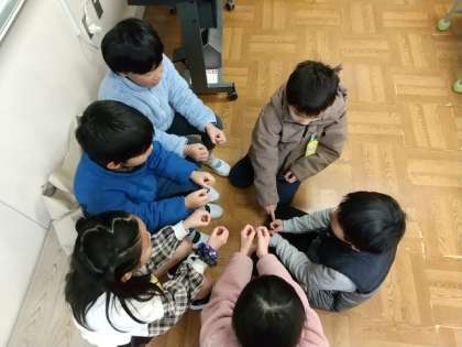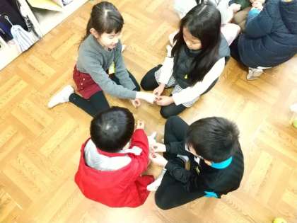 2年生が、童歌「ずいずいずっころばし」を歌いながら、グループになって手遊びをしています。