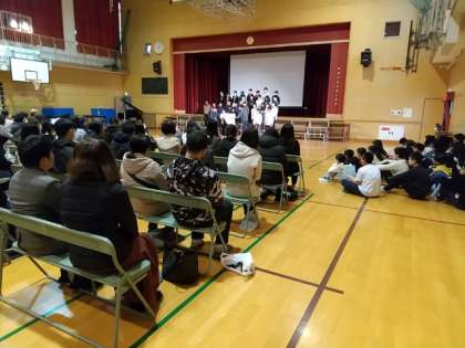 学級ごとの群読や学年全体の朗読劇、合奏などの発表をご覧いただきました。