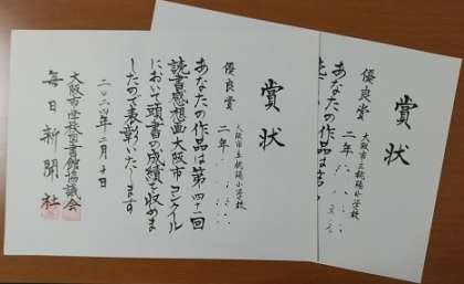 読書感想画コンクールで、2年生男子と2年生女子が、「優良賞」を受賞しました。