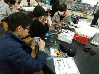 「マグネットやコイルを使って、電気信号を空気の振動に変える仕組み」を学びながら作っています。