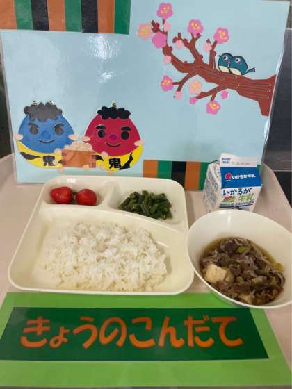 ●すき焼き煮 ●さんどまめのごまあえ ●いちご ●ごはん ●牛乳