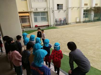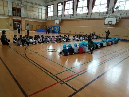あいさつをしてから、1年生が年長さんと手をつないで、学校を案内しました。