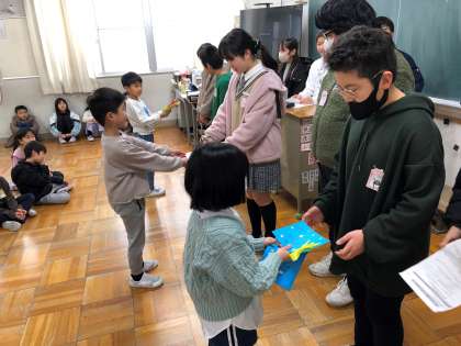 今年度は、桃陽グループで集まっての活動や「桃っこなかよしまつり」など、異学年での交流活動を復活させることができました。その中で、リーダーとして頑張った6年生に、5〜1年生の子どもたちが、感謝の気持ちを伝えました。