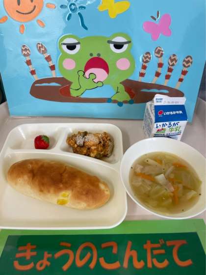 ●とうふのミートグラタン ●じゃがいもと野菜のスープ ●いちご ●おさつパン ●牛乳