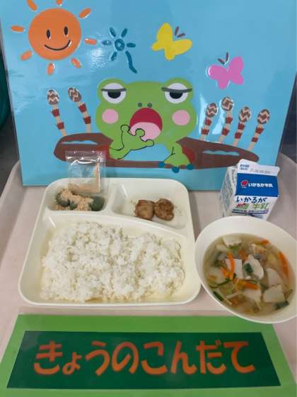 ●鶏肉のみそバターソース焼き ●五目汁 ●きな粉よもぎだんご ●ごはん ●牛乳