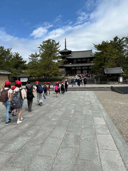 法隆寺に着きました。晴れ間もあります、お天気に恵まれました。
