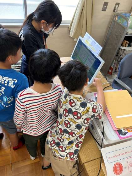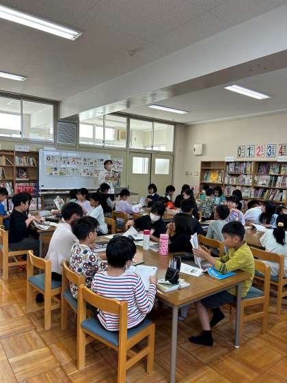 「図書館へ行こう」の単元では実際に図書館へ行き、テーマについて調べるための方法や資料の選び方について学習しました。司書の先生から「類語辞典」が紹介されました。たとえば「雨」と調べると「雨」に関する言葉がたくさん載っています。「雨」は知っていても、それに関する言葉がこんなにもたくさんあるのかと驚くほどです。今年、新しく図書室に入った、検索用パソコンで調べることもできます。