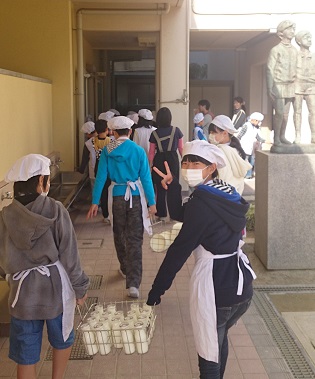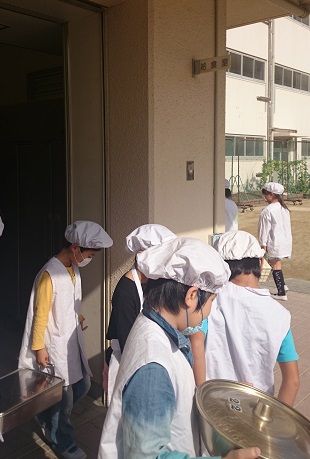 (上)給食係が一階の給食室から教室へ運びます。3階、4階に運ぶクラスは大変です。