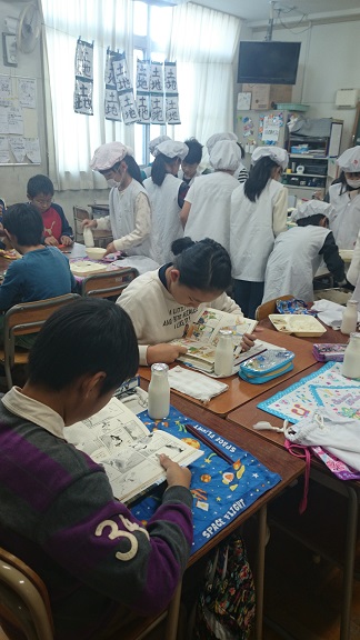 (下)配膳を待つ時間、本を読んで待っている子も少なくありません。