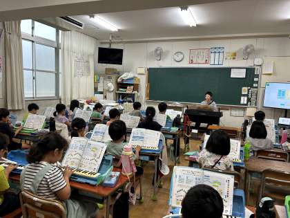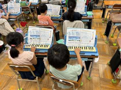 廊下を歩いていると、2年生の教室から鍵盤ハーモニカの美しい音色が聞こえてきました。2つのグループに分かれ「かえるのがっしょう」をおいかけっこで演奏しています。音の重なりを楽しみながら上手に演奏することができ、さすが2年生でした。
