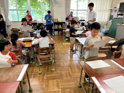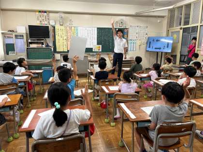 大阪市総合教育センターの先生に来ていただき、国語科の指導法について教えていただく研究授業がありました。教室には校内の先生もたくさん見学に来ました。授業のめあては「ききかためいじんになろう」です。少し緊張していた1年生ですが、友だちが見つけた言葉を正しく聞いて、声の大きさに気をつけながら班の友だちの伝えることができました。