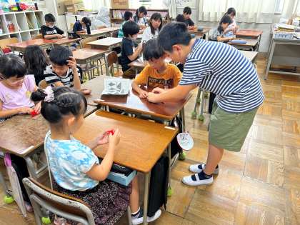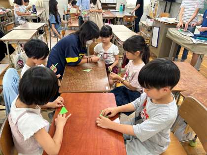 平和への願いを込めて、みんなで千羽鶴を折りました。6年生が1、2年生に優しく折り方を教えています。修学旅行で広島平和記念公園を訪れる際、6年生が学校を代表して完成した千羽鶴を納めます。