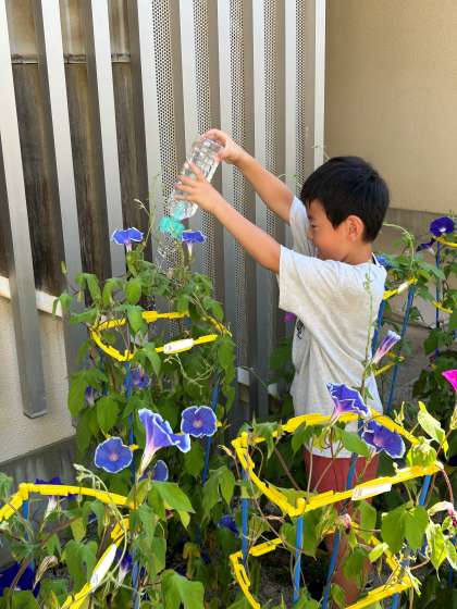 「今日は6個、咲いてる!」「ぼくは5つ!」元気な声が聞こえてきます。毎朝、水やりをしながら花の数を数え、アサガオの日々の成長や変化に気づくことができました。
