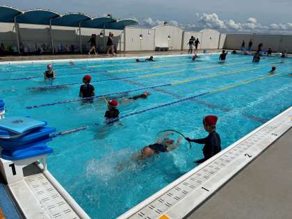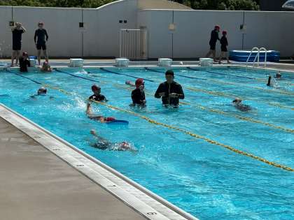 6年生は習熟度別のコースに分かれて、練習をしています。担当の先生の話を真剣に聞きながら、一生懸命に泳ぐ姿が印象的でした。