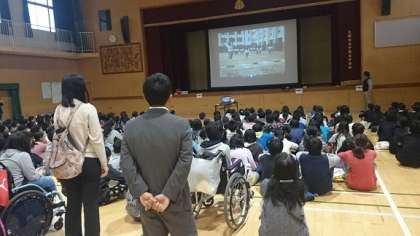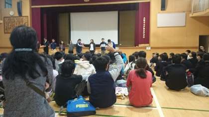 夕中の一年間の活動の映像を見た後、模擬授業を受けました。