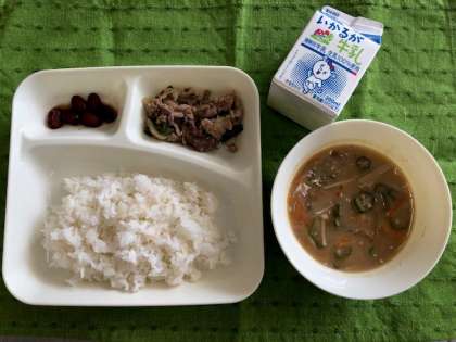 ●豚肉の甘辛焼き ●とうがんのみそ汁 ●金時豆の煮もの ●ごはん ●牛乳
