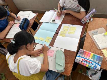 「弁当と給食」「国語と算数」「パンとごはん」などグループごとにテーマを決めて、それぞれの良さについて話し合いました。黄色の付箋には話し合う前の考えを、ピンクの付箋には友だちの考えを聞いてからの自分の考えを記します。身近な話題に多くの意見が出ていましたが、自分たちで意見を整理しながら話し合いを進めることができました。