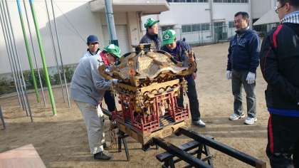 桃陽地区のお神輿。 桃陽の方たちの思いがこもったお神輿です。 今日一日、校庭に飾ります。