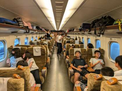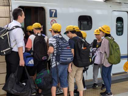 6年生は学校を出発し、バスで新大阪駅まで行きました。先程、予定通り新大阪駅から新幹線に乗車しました。