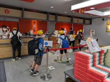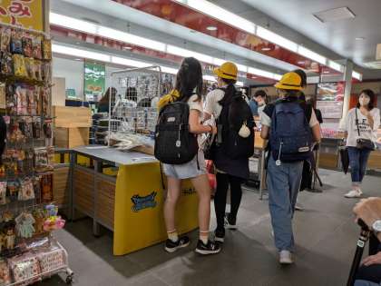 お土産タイムです。友だちと楽しそうに買い物をしています。天気にも恵まれ、今日は暑いくらいでした。