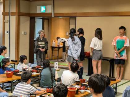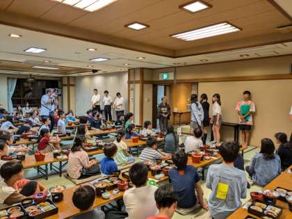 宿舎の夕食会場で、入館式を行いました。宿舎の方へ気持ちを込めて代表児童が挨拶をしました。宿舎の方のお話、校長先生の話もしっかり聞くことができました。