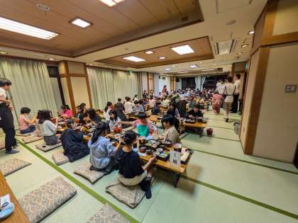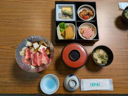 夕食のメニューは、春巻き、花ソーセージ、生野菜、鶏のから揚げ、だし巻き、鰆の若狭焼、ちくわの磯辺揚げ、カレーコロッケ、味噌汁、ご飯、すき焼きです。美味しくいただきました。