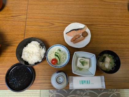 朝食のメニューは、焼鮭、ミートボール、ウインナー、冷奴、サラダ、御飯、味噌汁、(ふりかけ)です。朝からしっかりとご飯を食べています。