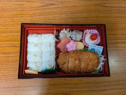 予定より少し早めに昼食をいただきました。昼食のメニューは、トンカツ、だし巻き、花ソーセージ、ポテトサラダ、キャベツ、昆布、花かまぼこ、焼売、プチトマト、御飯、たくあんです。