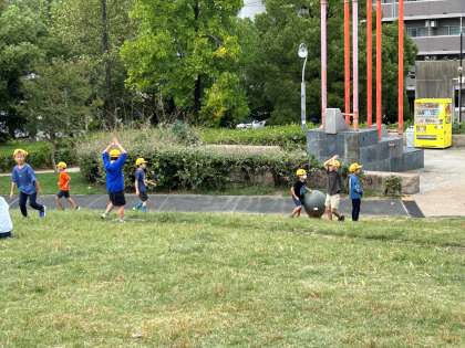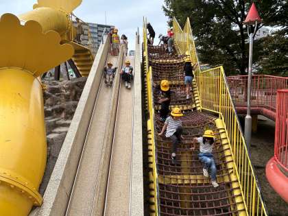 お弁当・おやつタイムの後は、扇町公園で自由遊び。大きなすべり台もあり、他の学校の友だちとも譲り合いながら仲良く遊びました。芝生広場では、鬼ごっこをするなど気持ちよさそうに走っていました。
