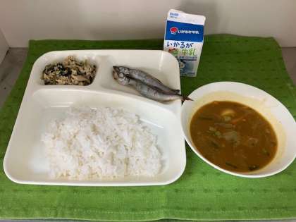 ●焼きししゃも ●さといもの和風カレー汁 ●ささみとこまつなのいためもの ●ごはん ●牛乳