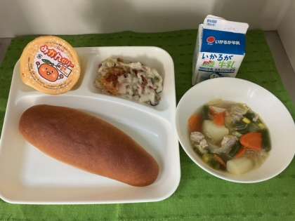 ●きのこのドリア ●鶏肉と野菜のスープ煮 ●みかんゼリー ●黒糖コッペパン ●牛乳