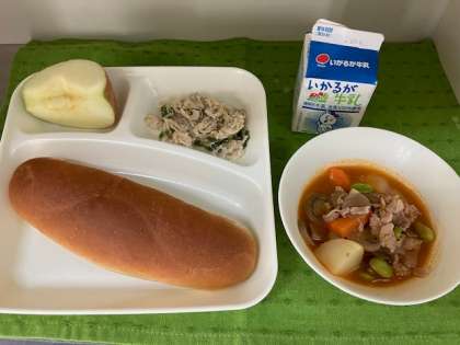 ●ケチャプ煮 ●ささみと野菜のソテー ●りんご ●黒糖パン ●牛乳