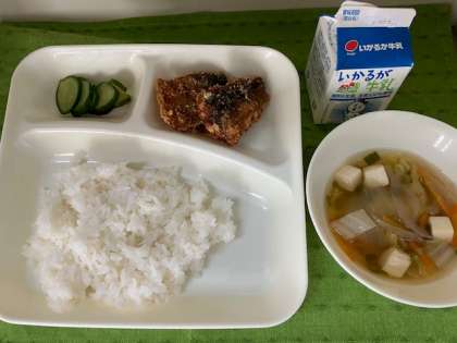 ●さばのカレーたつたあげ ●五目汁 ●きゅうりの甘酢あえ ●ごはん ●牛乳
