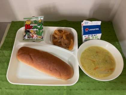 ●煮込みハンバーグ ●コーンスープ ●豆こんぶ ●黒糖パン ●牛乳