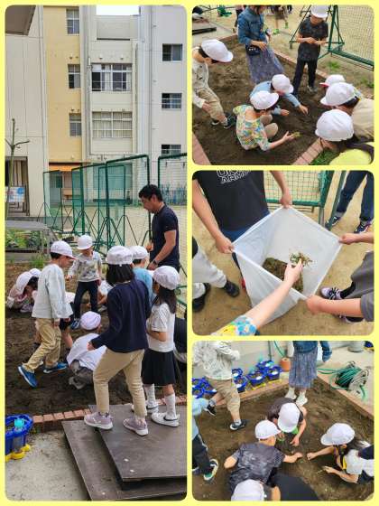 子どもたちは、雑草を抜いたり、根っこから土を落としたり、土を混ぜたりと一生懸命でした。