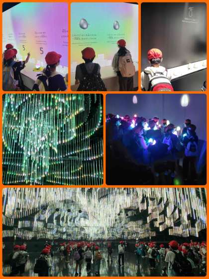 電力館最後は音と光の演出がすばらしく、子ども達からも自然と拍手が起きていました。『カーボンニュートラルを実現するために未来をつなぐエネルギーを大切にする』ということを学びました。その後、集めたエネルギーを確認して、可能性の卵を返却して、電力館をあとにしました。
