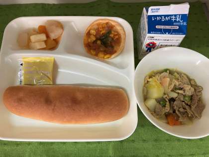給食の変わりピザは、ぎょうざの皮に新食品の「乳なしチーズ」とツナ、コーン、ピーマン、ピザソースを混ぜ合わせた具をのせ、焼き物機で焼いてます。