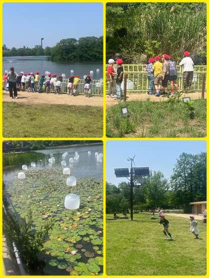 その後、池の横の広場で休憩しています。子ども達は、思い思いに自然を満喫しています。