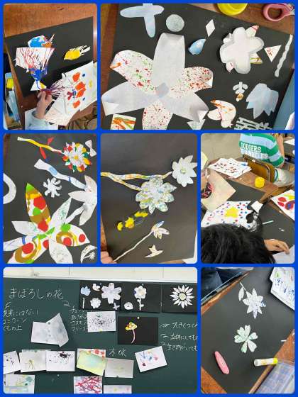 4年生は、図画工作科の学習で『まぼろしの花』をつくっています。様々な技法を使ってできた模様の画用紙を色々な形に切って、貼り方や組み合わせ方を工夫して、この世に一つしかない『まぼろしの花』をつくっています。完成が楽しみです。