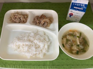 ●豚肉のごまみそ焼き ●五目汁 ●ツナともやしのいためもの ●ごはん ●牛乳